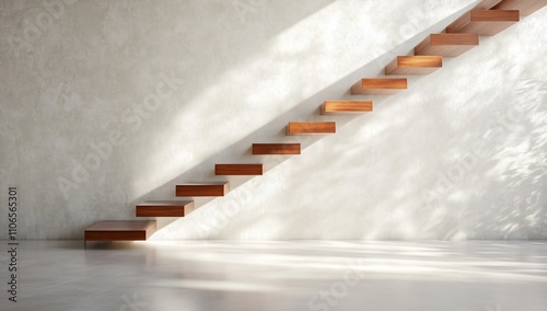 Modern wooden staircase against a textured wall with sunlight streaming through.