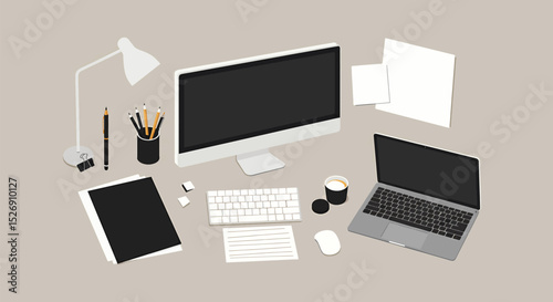 Modern Workspace Essentials Desktop Setup with Computer, Laptop, and Tablet