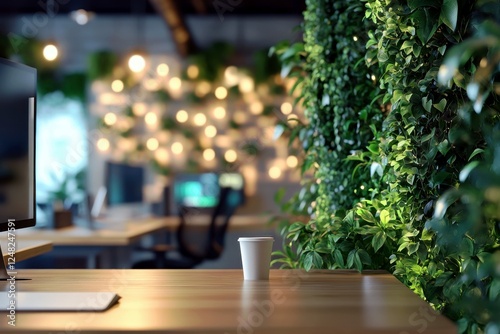 Modern workspace featuring a desk with a coffee cup and lush greenery wall enhancing creativity in a bright office environment with soft lighting