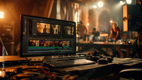 Modern workspace featuring computer with video editing software open, surrounded by various tools and equipment. atmosphere is creative and dynamic, with soft lighting and people collaborating