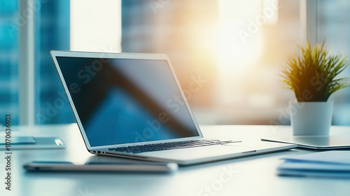 modern workspace featuring laptop, plant, and stationery, illuminated by warm sunlight. minimalistic design promotes focus and productivity