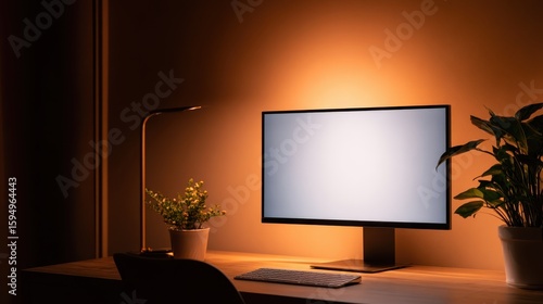 Modern workspace with a blank computer screen, desk lamp, and potted plants in a cozy setting