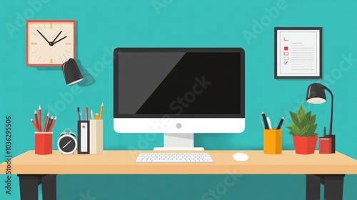 Modern workspace with a computer and office supplies, clean and organized, a place for creativity and productivity