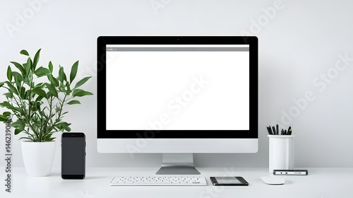 Modern workspace with computer and digital devices.