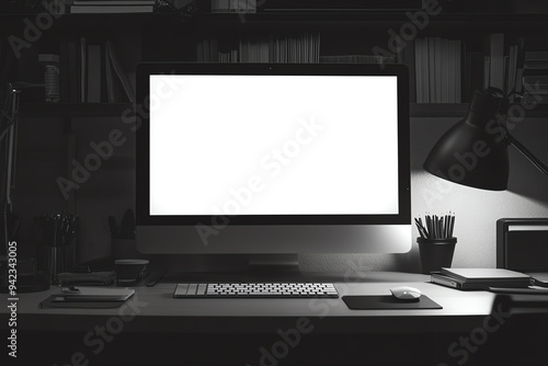 Modern workspace with computer, keyboard, lamp, and desk accessories. Screen is blank, offering template or digital design space concept.