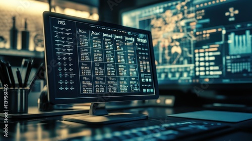 Modern workspace with multiple computer screens displaying financial data. Dark, professional interior.