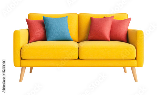 Modern yellow sofa with colorful cushions on display, cut out - stock png.
