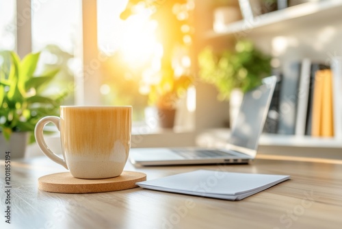 Moderno hogar oficina minimalista con luz natural y elementos decorativos acogedores