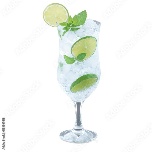 Mojito A crystal-clear cocktail filled with crushed ice, vibrant green mint leaves, and wedges of juicy lime, muddled with white