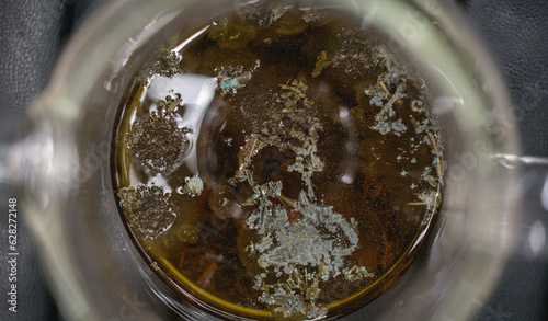 Mold on black tea in a teapot. Tea mold in a glass teapot close-up. Spoiled tea.