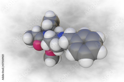 Molecular model of carfentanil. Atoms are represented as spheres with color coding: carbon (grey), oxygen (red), nitrogen (blue), hydrogen (white). Scientific background. 3d illustration