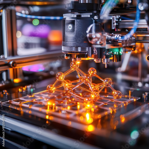 molecular structure is being built in 3D printer, showcasing intricate designs and vibrant colors. advanced technology highlights fusion of science and creativity