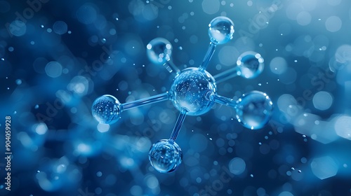 Molecular structure model, blue monochromatic color scheme, transparent glass atoms, interconnected bonds, scientific visualization, 3D rendering, macro photography.