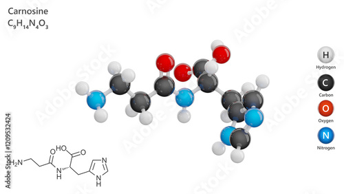 Molecule: Carnosine. Molecular structure. Formula: C9H14N4O3. Chemical model: Ball and stick. White background. 3D illustration.