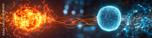 Molecule charged with solar energy. Solar energy is converted into electricity. An atom with protons and electrons. Abstract molecular structure. Scientific concept. Web banner.