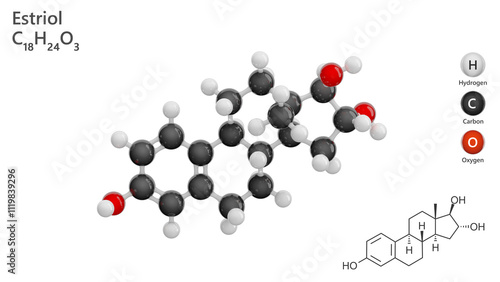Molecule: Estriol or Oestriol. Naturally occurring steroid hormone. Molecular structure. Formula: C18H24O3. Chemical model: Ball and stick. White background. 3D illustration.