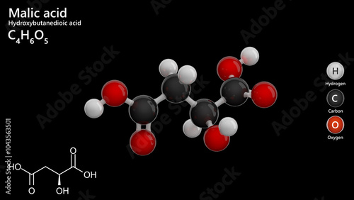 Molecule: Malic Acid. Molecular structure. Formula: C4H6O5. Chemical model: Ball and stick. E296. Food additive. Black background. 3D illustration.