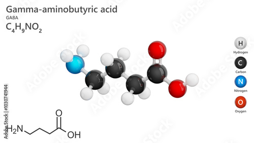 Molecule of gamma-aminobutyric acid (GABA). C4H9NO2. The main role of GABA is to reduce the excitability of neurons throughout the nervous system. White background. 3d illustration