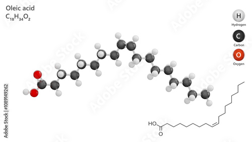 Molecule: Oleic Acid. Molecular structure. Formula: C18H34O2. Chemical model: Ball and stick. White background. 3D illustration.