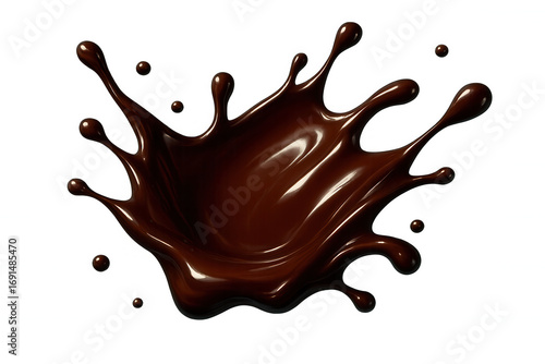 Molten chocolate cascading, forming royal-like splashes against transparent surface