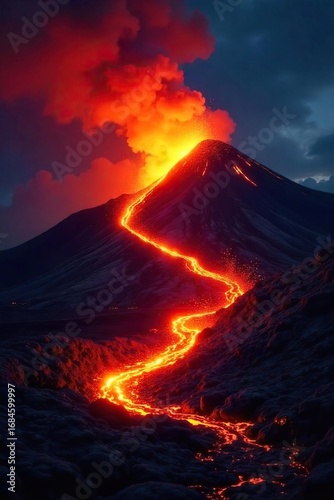 Molten lava flows relentlessly down a volcanic slope, glowing intensely against the night sky A dramatic display of nature's raw power and fiery destruction , orange, nature