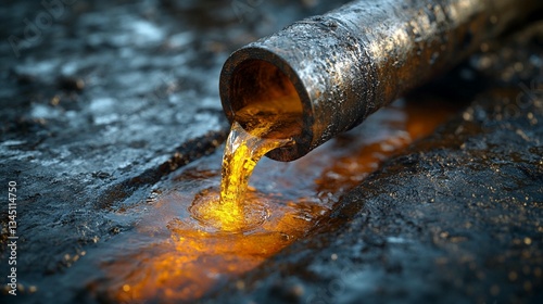 Molten metal flowing from pipe into dark surface.