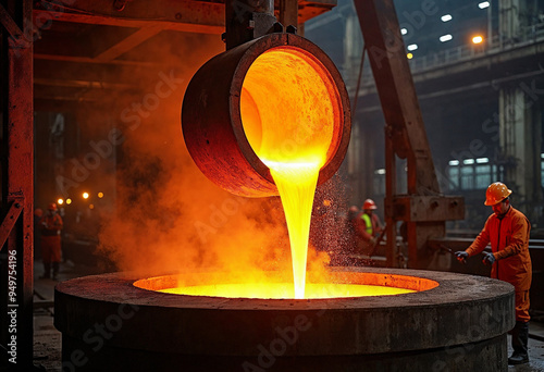 Molten steel is poured from a ladle into a mold, creating dramatic splashes in a busy industrial setting.