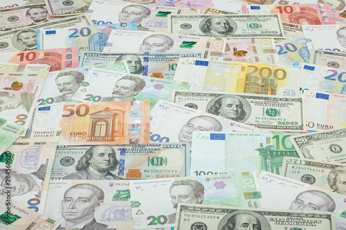Money and finances concept. One hundred dollar new bill on colorful abstract background of Ukrainian, American and euro national currency banknotes