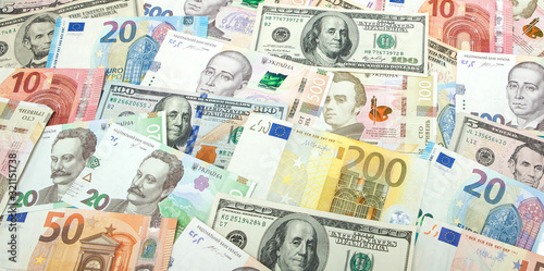 Money and finances concept. One hundred dollar new bill on colorful abstract background of Ukrainian, American and euro national currency banknotes