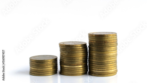 Money coins stack with macro close up Isolated on white backgrounds. Place your text