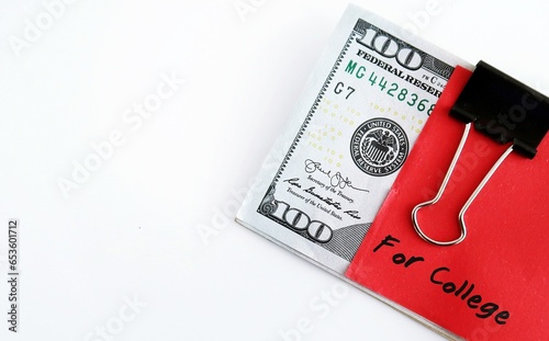 Money management saving plan - Dollars cash money clipped with red note written FOR COLLEGE on white background with copy space- concept of money set aside for education