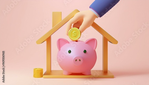 Money-Saving Concept: Hand Adding Coin to Piggy Bank with House Key,Investing in Real Estate: Hand Putting Coin into Piggy Bank with House