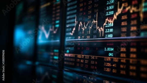 Monitor of stock market report. display, information, datum, stock exchange, investment, stock, market, technology, digital, business, finance. (Generative AI)