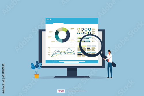 Monitoring and analysis report statistics, investment, website SEO screen PC monitor with tiny people concept. business people and stock market database, information graph illustration