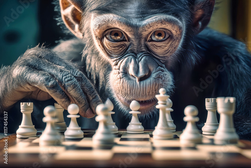 Monkey deep in thought, strategizing moves in an intense chess game with white pieces on a rustic chessboard