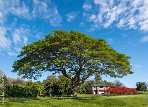 Monkey pod tree in a green lawn by a little house and red Poinsettia bushes. Cona. Big Island of Hawaii. USA