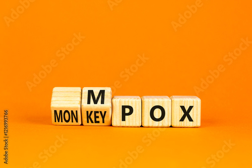 Monkey POX or Mpox symbol. Concept word Monkey POX or Mpox on wooden cubes. Beautiful orange table orange background. Medical Monkey POX or Mpox concept. Copy space.