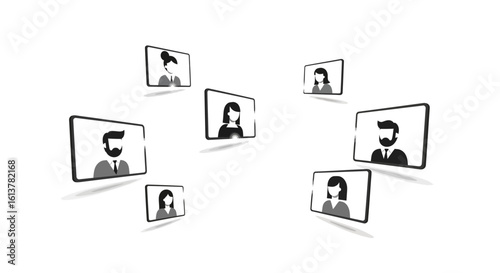 Monochromatic vector art of a virtual team conference with avatars on digital screens.