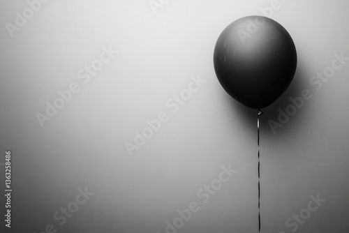 Monochrome balloon floating against a textured wall creating a somber mood in a minimalist style with soft lighting and a high angle shot