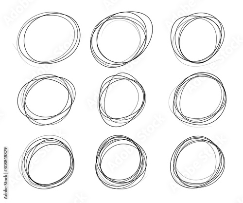 Monochrome circles, square, sketch, selection. Hand-drawn, scribbled. Design elements isolated on a light background.