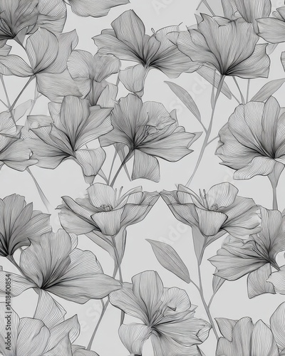 Monochrome floral pattern with elegant, linear flower illustrations creates a timeless and sophisticated background design.
