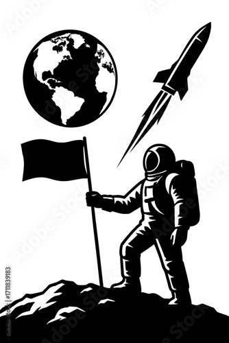 Monochrome graphic of an astronaut explorer on a celestial body with Earth and a rocket