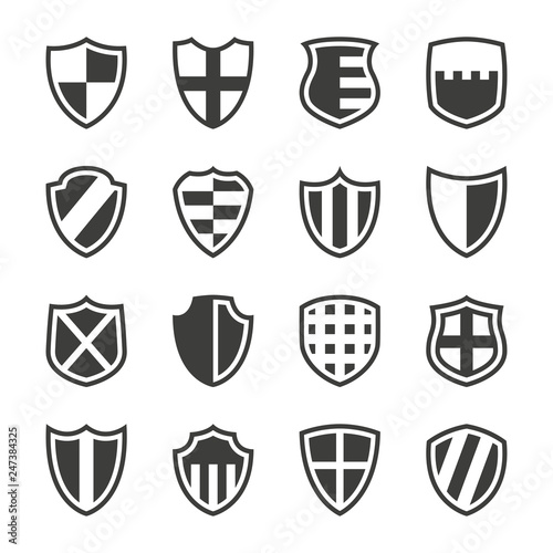 Monochrome vector illustration of a set shields icons, isolated on a white background.