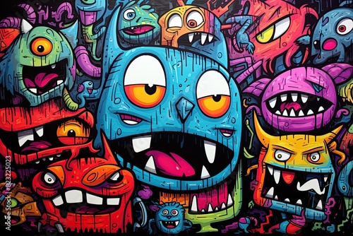 Monsters doodle drawing in pop art style. Cartoon set of funny comic creatures. Poster design. Ai generative
