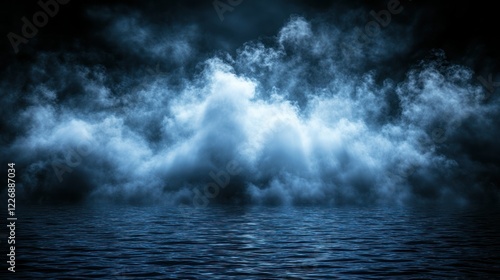 Moody ocean fog, dark night, atmospheric, reflective water, background