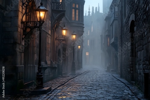 Moody Rainy Night in Medieval City Alley with Glowing Lanterns and Cobblestone Path
