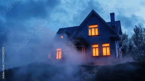 Moonlight barely breaks through thick mist surrounding an old house with glowing windows