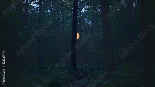 Moonlit path through a forest with trees casting shadows and fireflies dotting the dark scene Natures quiet beauty un