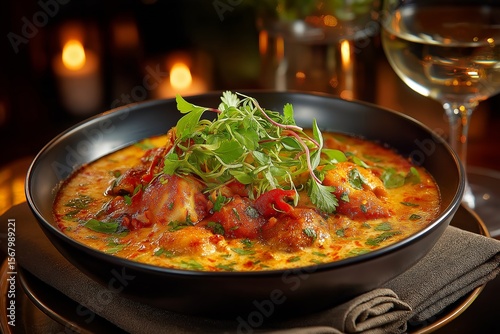 Moqueca, brazilian seafood stew in black bowl, creamy curry, chicken, vegetables, garnished with cilantro. Concept of moqueca, warm cozy atmosphere with soft lighting.