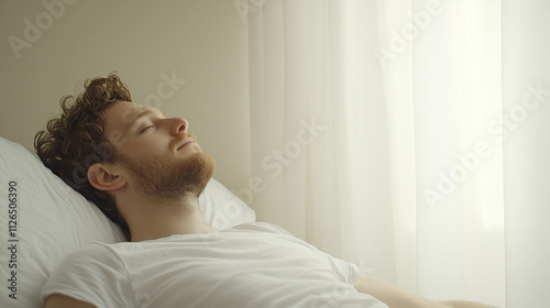 Morning Calm: A young man, eyes closed, lies in bed, bathed in soft morning light. The peaceful scene evokes a sense of tranquility and relaxation.